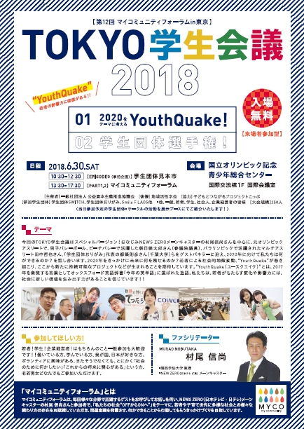 テーマ:今回のTOKYO学生会議はスペシャルバージョン! おなじみNEWS ZEROメーンキャスターの村尾信尚さんを中心に、元オリンピックアスリートで男子バレーボール、ビーチバレーで活躍した朝日健太郎さん(参議院議員)、パラリンピックで活躍されたマルチアスリート田中哲也さん、「学生団体おりがみ」代表の都築則彦さん(千葉大学)らをゲストパネラーに迎え、2020年に向けて私たちは何ができるのか? を話し合います。ホスト国である私たちが2020年をきっかけに未来に何を残せるのか? 若者による社会的地殻変動、”YouthQuake”が巻き起こり、ここから新たに持続可能なプロジェクトなどが生まれることを期待しています。”YouthQuake(ユースクエイク)”とは、2017年を象徴する言葉としてオックスフォード英語辞書「今年の英単語」に選ばれた造語。私たちは、若者がもたらす変化や影響力には、社会に新しい価値を生み出す力があることを信じています!!